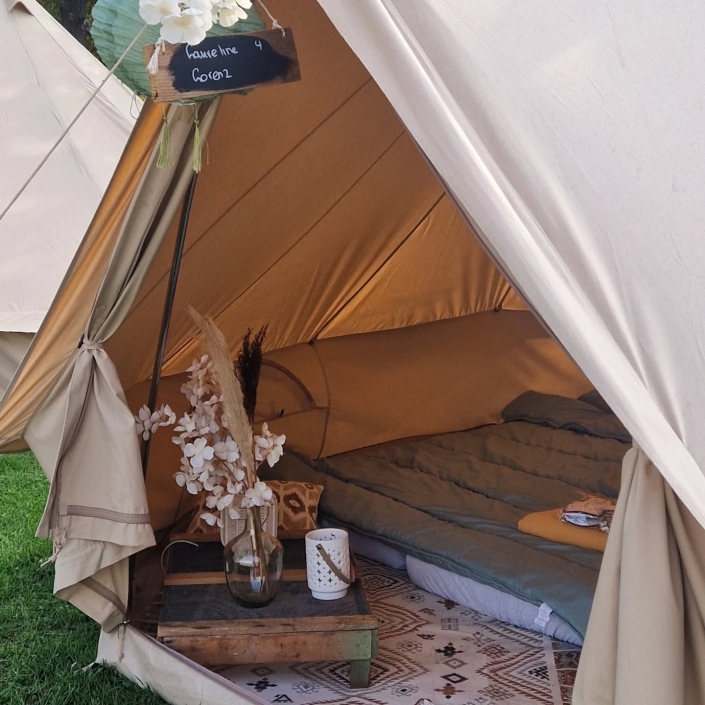 Zo hangen wij standaard aan de gastentipi’s een jute vlaggenlijn, steken we droogbloemen of bamboe takken in de punt en heeft elke tipi zijn eigen sfeerlampje.