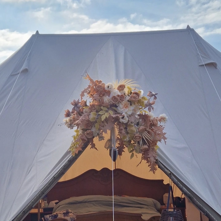 Bij het huren van onze bruidstipi richten wij de bruidstipi geheel sfeervol in met een vintage stijl ledikant of palletbed en bijpassend beddengoed. We hebben daarbij de keuze uit verschillende stijlen: Kant,roze met romantisch rieten meubels, kleurige Vincent van Gogh stijl, of een natuurlijke look met vooral veel groen, robuust hout en vintage.